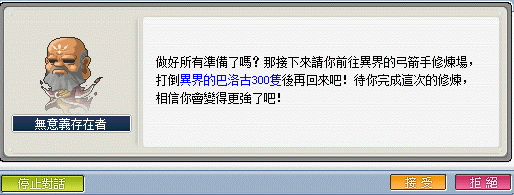 16.和NPC – 無意義存在者對話,選擇 想要前往異界的弓箭手修煉場