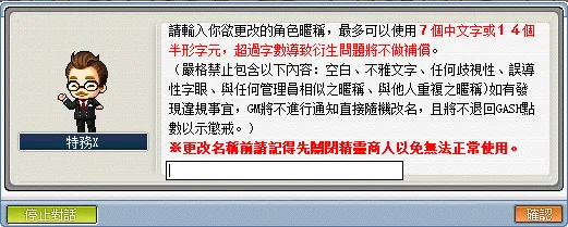 『更改角色名稱』─花費3000遊戲點數(可選擇使用GASH、楓葉點數)來更改你的角色名稱,使用說明如下圖。