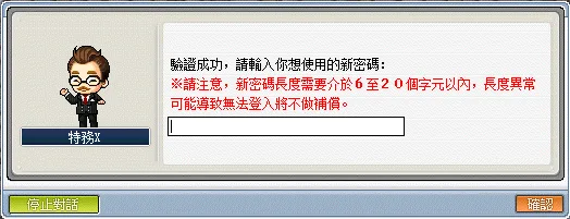 『更改遊戲密碼』─花費3000遊戲點數(可選擇使用GASH、楓葉點數)來更改你的遊戲帳號的登入密碼,驗證完舊密碼後如下圖輸入新密碼即可。