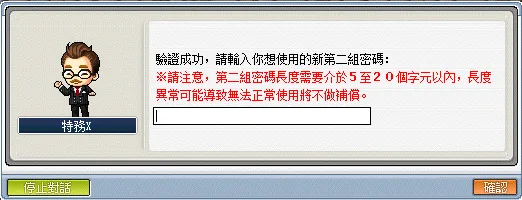 『更改第二組密碼』─花費1500遊戲點數(可選擇使用GASH、楓葉點數)來更改你的第二組密碼(使用倉庫、刪除角色、商城送禮時的驗證密碼),驗證完遊戲密碼後如下圖直接輸入新第二組密碼即可。