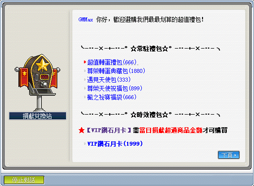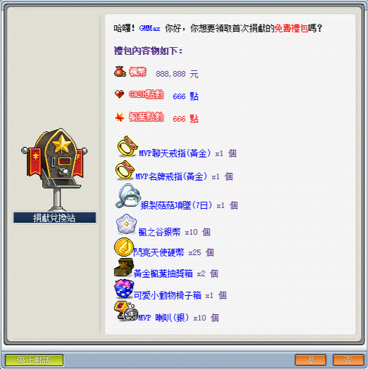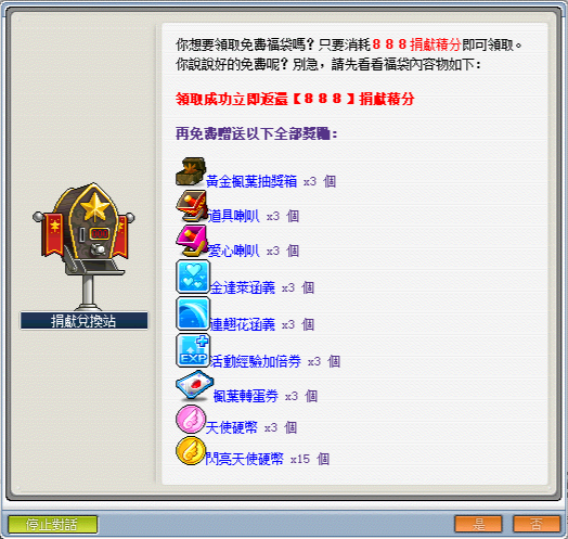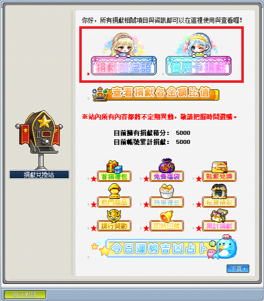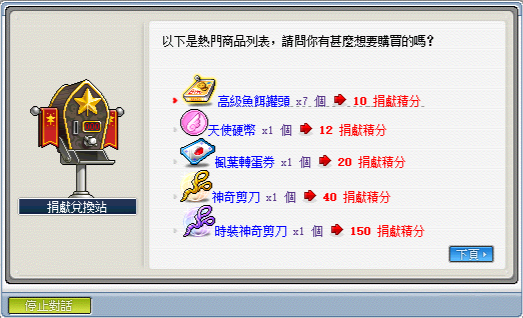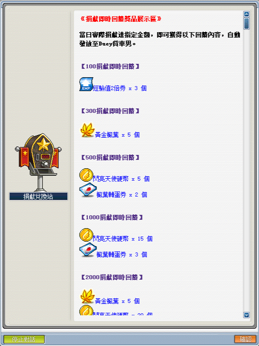 《點數兌換》─可使用捐獻積分兌換遊戲點數比值:1(捐獻積分):10(GASH點數);1(捐獻積分):12(楓葉點數)
