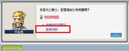- 接取轉職任務(二):成功接取轉職任務後找各職業騎士團長,接取轉職任務─《變身術師》