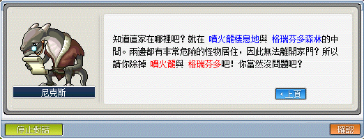 - 依照要求前往噴火龍棲息地與格瑞芬多棲息地擊殺噴火龍與格瑞芬多後,回去找尼克斯回報任務