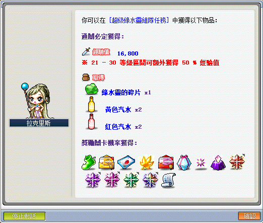 下忍 - 在 21 等後也可以組隊進行「超級綠水靈組隊任務」,還可以獲得實用的紅(黃)色汽水跟機率獲得稀有獎勵,詳情可查看組隊任務攻略。