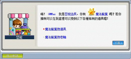 接下來就是介紹魔法楓葉的用途,前往楓葉飯店,並找到左上方的魔法商店,即可查看魔法楓葉的各式各樣用途