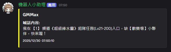 特別的是除了在遊戲內發起廣播外,還會於Discord伺服器內的即時組隊頻道同步廣播尋找尚未上線的小夥伴。