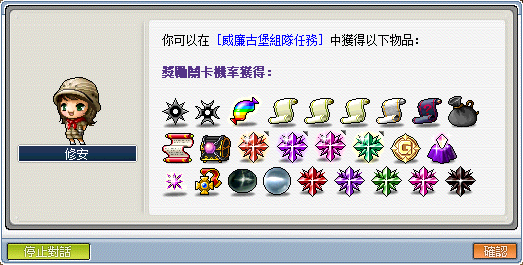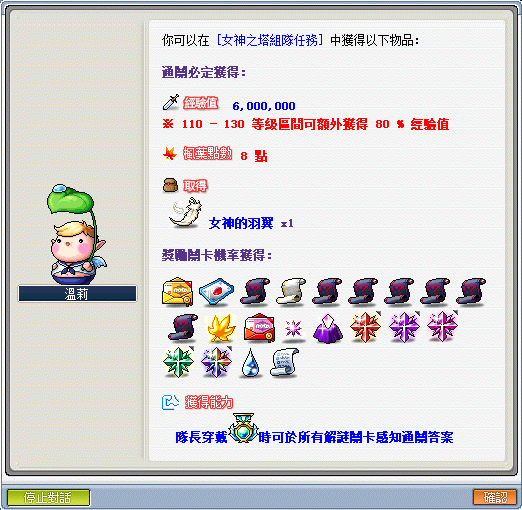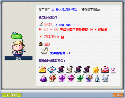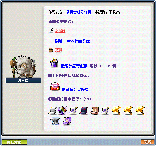 1.每次通關後與瑪塔塔對話可領取關卡獎勵,可能獲取獎勵如上述展示。