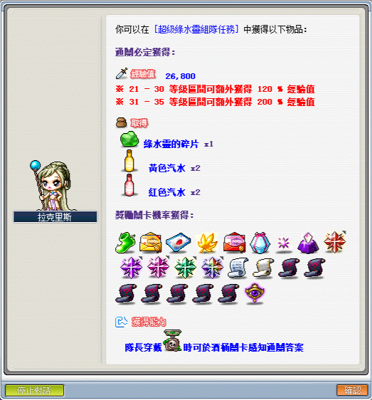 ※進場條件:角色必須達到 21 等級以上,人數限制 3 ~ 6 人,推薦練功等級 21 ~ 35