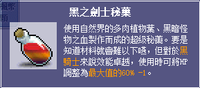 ※黑之劍士秘藥─楓蜜語專門為黑騎士所打造的特殊藥水,搭配其四轉的獨特技能「黑暗力量」所開發的新品