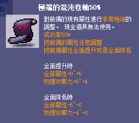※極端的混沌卷軸50%─隨機調整裝備已擁有的素質隨機進行非常極端的調整,可能帶來非常驚喜的效果