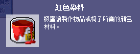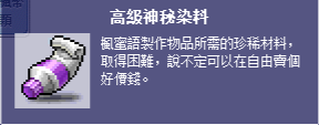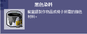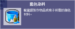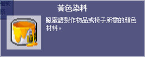 以下部分製作材料除了高級染料可在此使用組隊任務象徵物兌換外,其餘皆在全伺服器所有箱子、石頭…等反應堆打破後低機率獲取。
